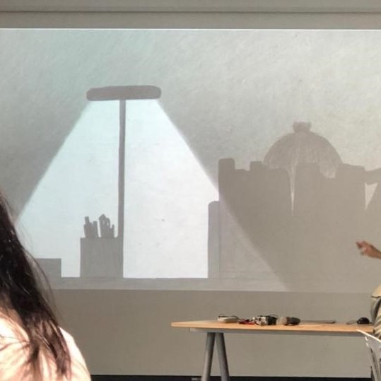 與其說〈爸爸的房間〉是一部記憶記時的影片,講師認為更像是主角心情的情緒紀錄。接著對大家提問關於主角的房間大小的看法,有些人覺得房間很大,有些人則不認為。對此講師說到其實兩者皆對,因為空間不斷在改變,而以寫實空間而言,房間如同一般大小的房間有書桌、衣櫃,但在爸爸進入女兒的房間後,呈現的空間感卻更大了?試著以心情的空間設想,女兒身處灰暗的房間,唯一的光線是從門縫透進的光源,光線一端是縮在角落的女兒,延伸到門縫處另一端的是即將爭吵的父母,以房間大小呈現出女兒心理上的距離,將抽象情感具象化。片中也有需多場景是主角的心理空間與實體空間(房間)的交錯融合,像是主角穿著高跟鞋從玄關走出(寫實),而高跟鞋的型態由幾隻手組成,就如同心理層面的過往羈絆、創傷陰影牽絆著主角的腳部(非寫實)。透過寫實與非寫實空間的交流,將情感視覺化、聽覺化、觸覺化,觀者能體會到動畫情緒的表達,遊走在虛擬和實體的空間。