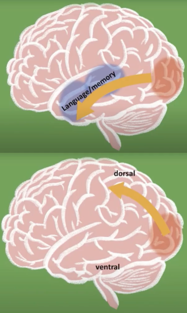 進入初級視覺後,我們大腦將分為兩個路徑,一為腹側路徑(ventral pathway),抵達「語言區」和「記憶區」(圖3上圖) ,讓我們得以透過「語言」描述所看見的畫面,與此同時經由「記憶」處理,以利下次聚會看見同樣的面孔,記憶得以與語言相連,呼喊朋友的名字。透過記憶,我們可以知道「我們看見了什麼」,比如看見眼睛、鼻子與嘴巴,腹側路徑的腦神經將這三個部分合在一起,讓我們認出這是一張臉,同時這也牽涉到完形心理學(格式塔理論),皆是透過腹側路徑進行組合。