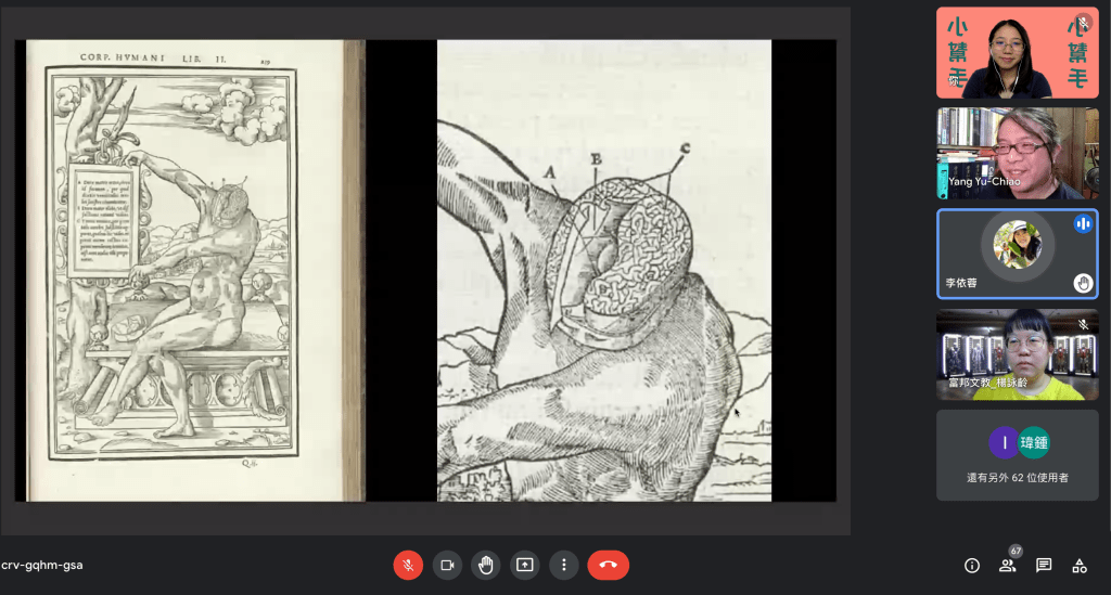 上面這張圖(圖4),你看到什麼呢?「腦的組織?」「長得像航海王惡魔果實的巨人!」「坐在野外如棺材的石臺上。」老師們熱烈點出圖像的細節,展現人體肌肉、手上拿著一張如告示的文宣,以拉丁文寫著腦的皮層,然而這張解剖學圖的關鍵,在於他將原本應當一片白淨的背景,抽換成自然風景,隱喻人體運作宛若大自然更迭,隨時間滋長潛息,生命消長與時間輪轉,逐步發展成圖像的母題。