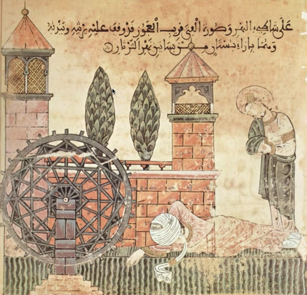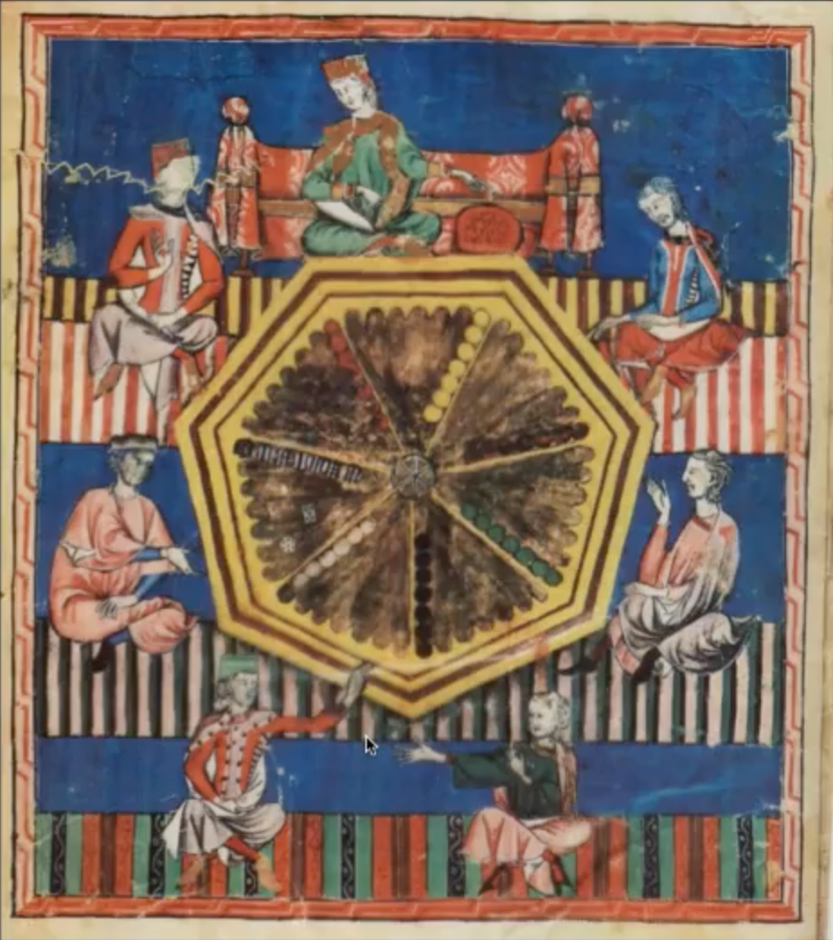 畫面經過視網膜看似靜止,實則已經於記憶中啟動。諸如(圖5)中的水車,底下波浪型線條宛若微風輕拂,提示旋轉運作,側臥一旁的人物滿懷失意惆悵,因身分地位而戀情未果。透過水車輪轉,聯想太陽繞行、日晷推移,意喻時間消逝、人生無常,最終走向哀戚的結局。(圖6)中如俄羅斯輪盤的圖像,更透過「骰子」、「籌碼」的機運變化,點出「命運之輪」的無常,或許得以換得榮華富貴,卻也可能風水輪流轉而窮困遼倒。透過命運「輪轉」,輪盤旁席地而坐的人們好似動了起來,起身擲出骰子、堆高籌碼,在輪盤旋轉中生命隨之起伏跌宕。