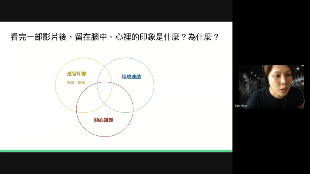 婉真講師向大家提出這個問題。感官的強烈印象,結合日常的觀影或閱讀習慣經驗的累積,或是受所處環境影響,以及對故事議題的敏銳度,這些元素容易使我們對畫面產生更加濃厚的連結,婉真講師彙整出三大要素,停留在觀影者心中的畫面可能來自於:感官印象、經驗連結與關心議題。