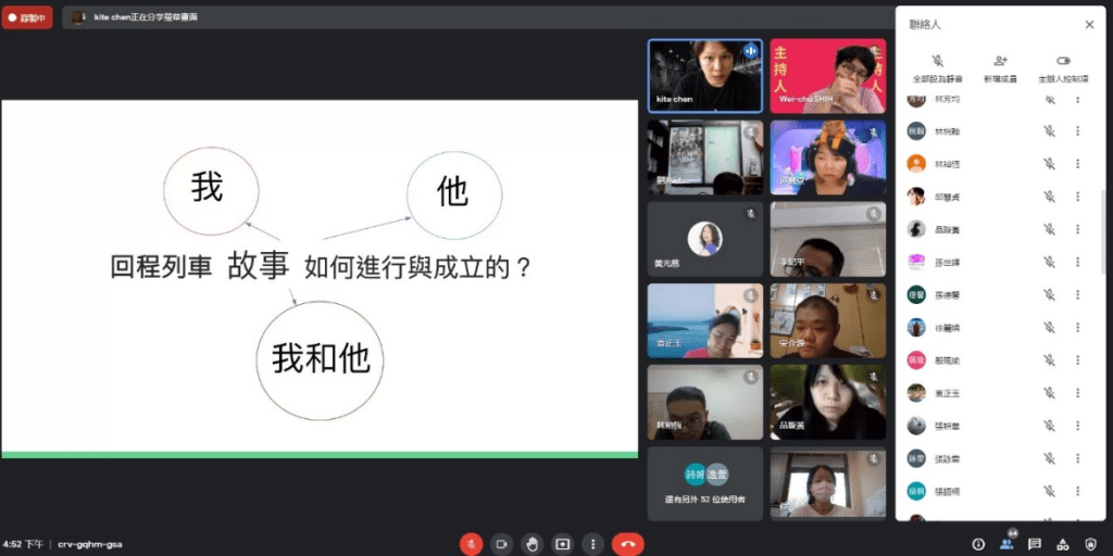 黃邦銓導演為觀影者帶來不同於「眼見為憑」的概念,藉由重新組合照片,在旅途行駛的過程中穿插影像所創造的抑揚頓挫,用畫面訴說敘事者的心境,回歸本次的影像教育創新實驗室旨在注重感受力與體驗,陳婉真講師以自身經驗與老師們互動、分享想法,構築觀影者與電影《回程列車》之間感官的橋樑,感受影像的隱喻緊密連繫觀影者的生命經歷,賦予體感上的饗宴。