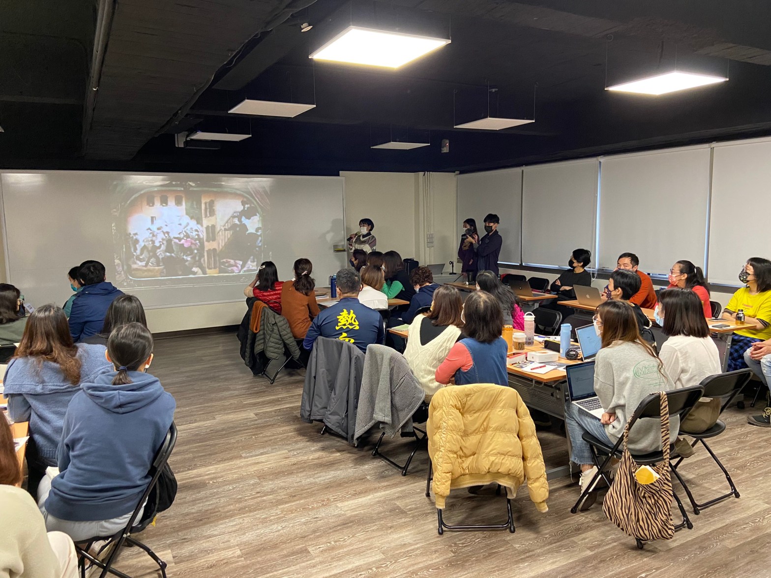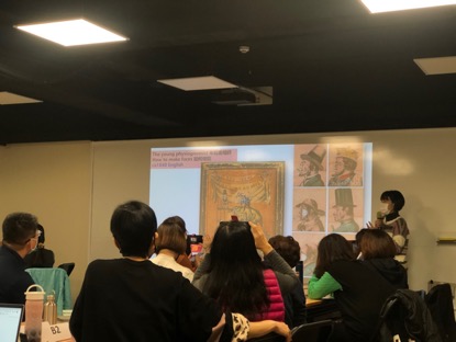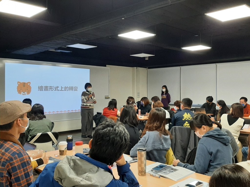 「對於『繪畫形式上的轉變』,有沒有老師先有了一些想法呢?」許岑竹先向老師們提問。野獸派、立體派等繪畫風格的不同是老師們首先想到的形式變化,許岑竹說這可以是一種,但這樣的轉變還只停留平面上,也繼續問大家是否有其他想法。接者老師們回應是不是繪畫形式從2D到3D的轉變,3D相較2D多了空間感?許岑竹肯定了老師們的說法,就是繪畫形式上多了「空間感」。
