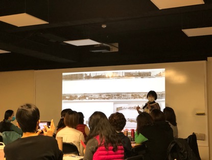 全景圖的繪製表現形式具有多樣性。許岑竹先是以Edward Ruscha的全景圖舉例,接著再舉出一幅以泰晤士河為繪畫主題的全景圖說明,此幅的特色在於將長達四公里的泰晤士河沿岸,繪製在一張非常長的長條紙上。後人為了方便收藏此類畫作,會將作品「切割」,均分成數分並錶框收藏。而這樣將長幅全景圖分段收藏的作法,再度將繪畫形式階段推往下一階段—Myriorama。Myriorama又名「萬景圖」,是將長篇幅的全景圖分割後,再重新組合多種不同的圖像,也是與觀者具有高度互動性與娛樂性的圖像形式展現。