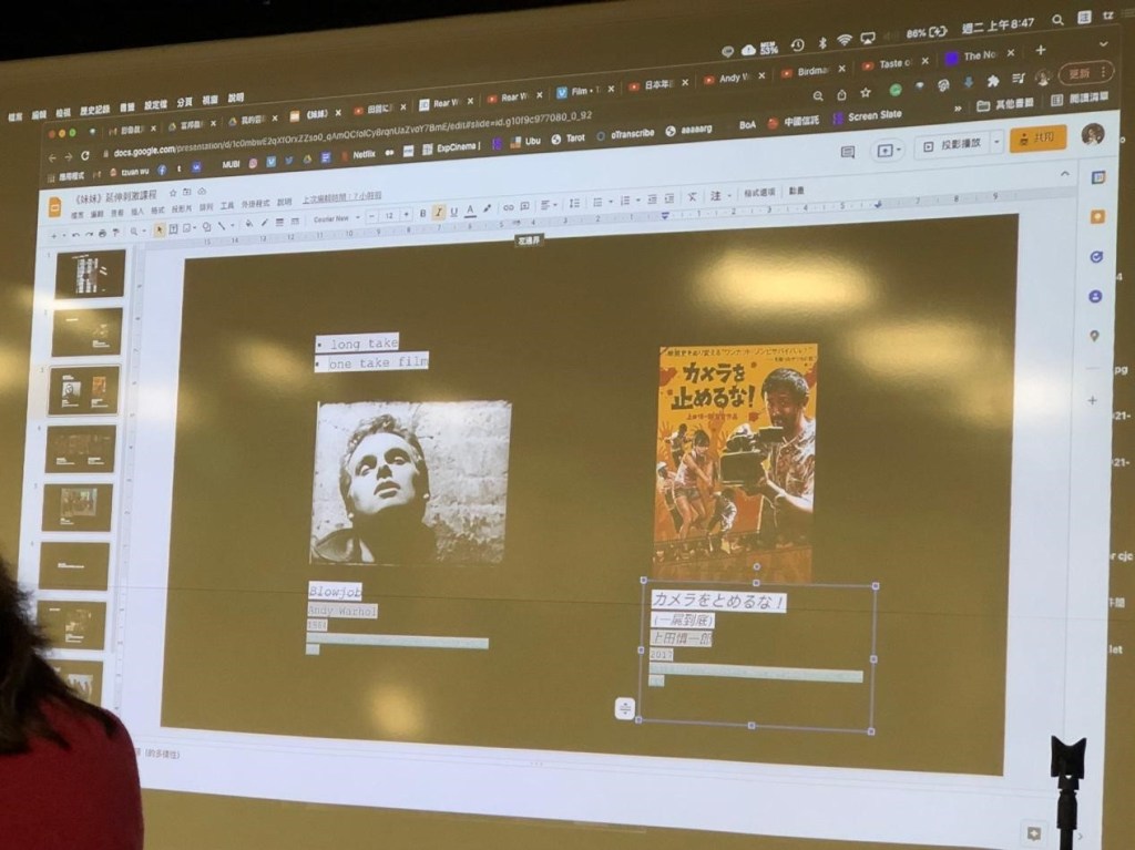 一部電影中一個鏡頭的時間內想傳達、可表達的東西,我們將之籠統地稱為場面調度。在《妹妹》十九分鐘的片長中只有一個鏡頭,完全沒有透過剪接(蒙太奇)表達,而是透過鏡頭時間內各種元素的變化以呈現劇情結構。接著吳梓安以《鳥人》Birdman or The Unexpected Virtue(Alejandro González Iñárritu, 2014)的電影片段舉例,導演在拍攝過程沒有關閉鏡頭似一鏡到底的拍攝手法,其實在拍攝過程仍有分段,並在後續透過剪接連結片段營造一鏡到底之感。看完片段後其中一位老師分享他對此片段的看法:「導演藉由音樂節奏呈現主角窘境,鏡頭跟拍方式讓觀眾貼近主角,也讓劇情帶有弔詭、荒謬的喜劇之感。」吳梓安接著說明導演用一顆鏡頭拍攝主角穿越後台、時代廣場、及劇院舞台三個空間,透過取景、框限達到切割畫面的效果。