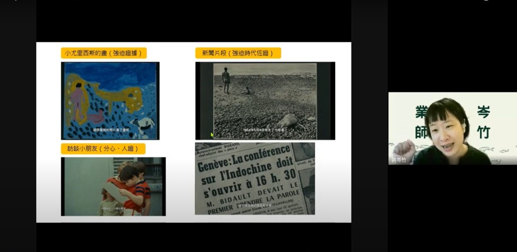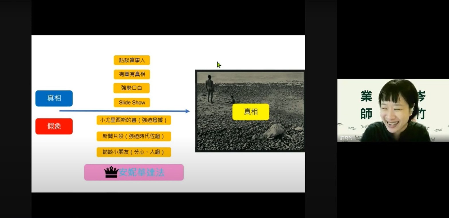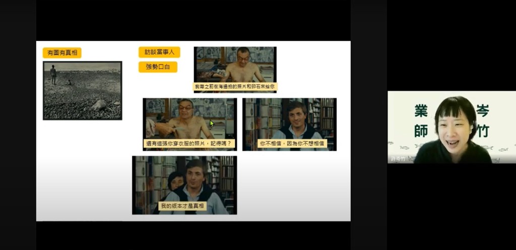 「請大家現在開始都不要懷疑我所說的一切」,業師許岑竹微笑著,以令人捉摸不透的開場白拉開了課堂的的序幕。法國導演安妮.華達拍攝的《尤里西斯》是部由一張年代久遠的黑白照片引領的紀錄片,導演在影像中運用了記憶訪談、記憶辯證以及記憶拼湊等手法,將照片透過記憶與真相連結,使得觀眾在第一次觀看這部影片時,對眼前的故事深信不疑。