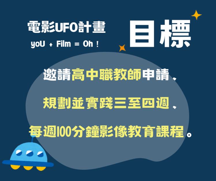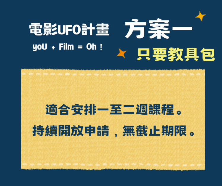 本計畫邀請高中職教師申請使用本單位之教具包(包含教學點子書、電影教材),鼓勵教師規劃並實踐三至四週、每週100分鐘的影像教育課程,並設有以下兩個方案 :