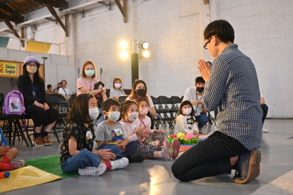 周宣宏講師首先以「紅豆哥哥」的身分,與在場大小朋友自我介紹,並讓小朋友們互相打招呼、熟悉彼此。接著進行暖身活動,播放日常生活中常見的聲音,如小鳥、蜜蜂、貓狗等各種生物,讓小朋友們聽聽看與猜猜看,並模仿聽到的聲音。藉此與小朋友們拉近距離、消除緊張感,同時引導大家進入下個活動環節。