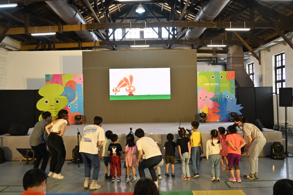 排練過後,正式的影片擬音開始了,透過設備進行現場的聲音錄製,再經由「紅豆哥哥」協助,擬音影片終於大功告成。在將成品送給影視國王之前,紅豆哥哥邀請大家一起欣賞影片。每個人專注地看著原本無聲的動畫,搭配上自己模仿的蜜蜂、小鳥、火箭,還有各種情境搭配的不同音效,透過「聲音」為影片增添了更多效/笑果,一旁的家長們也紛紛拿起手機拍攝孩子入迷的神情,親子們都充分感受到電影擬音的樂趣與成就感。