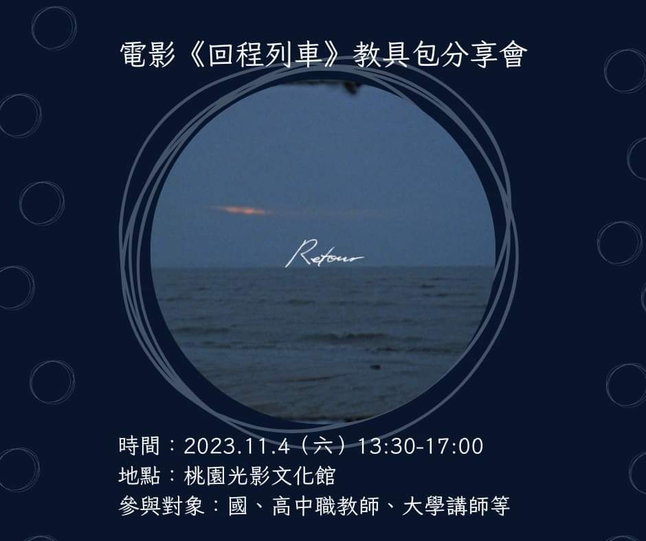 本次分享會將於11月在桃園光影舉辦,以黃邦銓導演的《回程列車》為分析影片,除了邀請業師進行影像分析課程,也邀請已完成入班教學的種子教師,親自帶領參與教師參與點子活動,通過實際互動來感受樂趣,並啟發對電影的深刻體會;同時,參與教師也會更了解如何將教具包融入課堂教學,賦予學習全新的意義!
